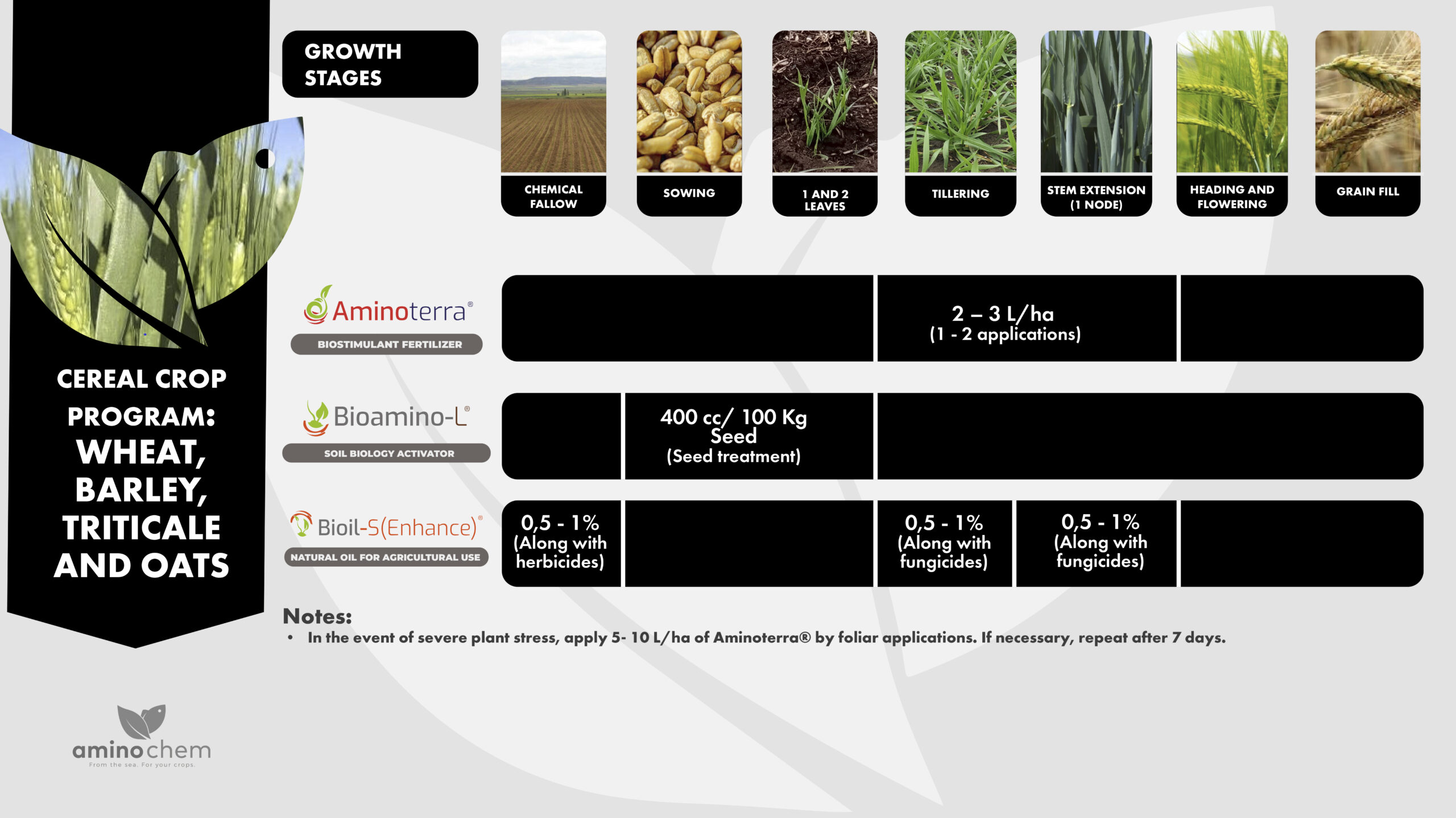 Doses and application times are suggestions, not necessarily representing a specific recommendation. The company bears no responsibility for any misuse or mishandling, as well as any adverse effects derived from these. For a proper dosage, contact your technical consultant.
